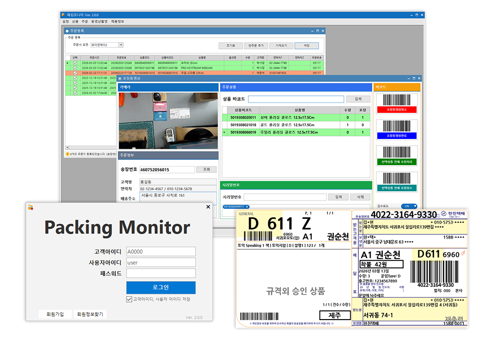 패킹모니터는 송장번호를 기반으로 상품의 포장과정을 녹화하고 상품 바코드 비교를 통하여 오포장과 오배송을 사전에 방지하고 고객의 클레임에 효과적으로 대응할 수 있는 솔루션입니다.