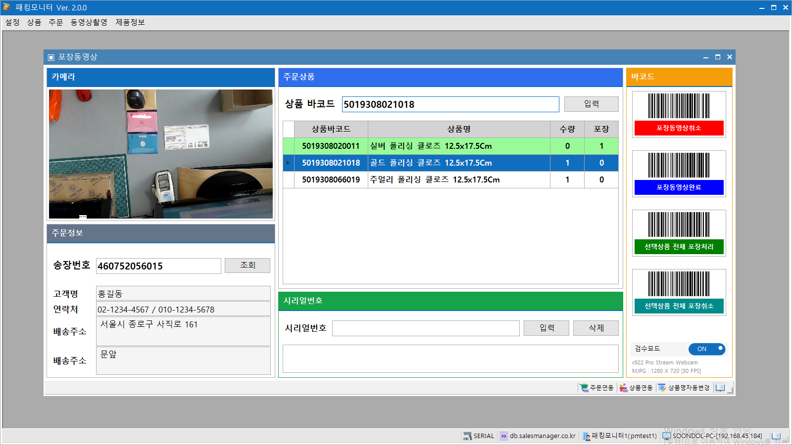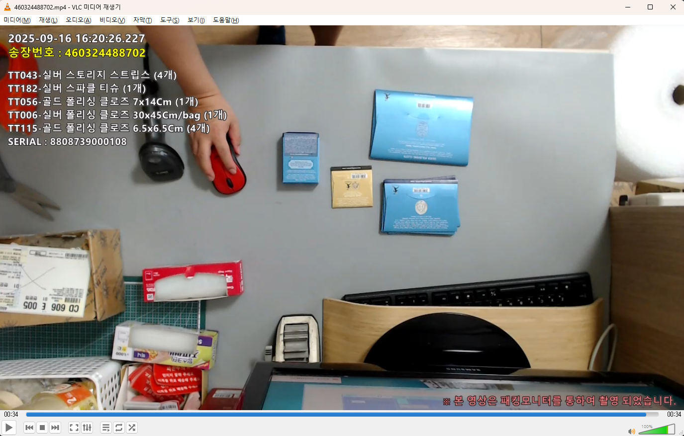 송장번호, 상품코드, 상품명, 수량, 시리얼 번호 등 모든 정보가 동영상에 포함되어, 재생만으로 포장 과정을 한눈에 확인할 수 있습니다.