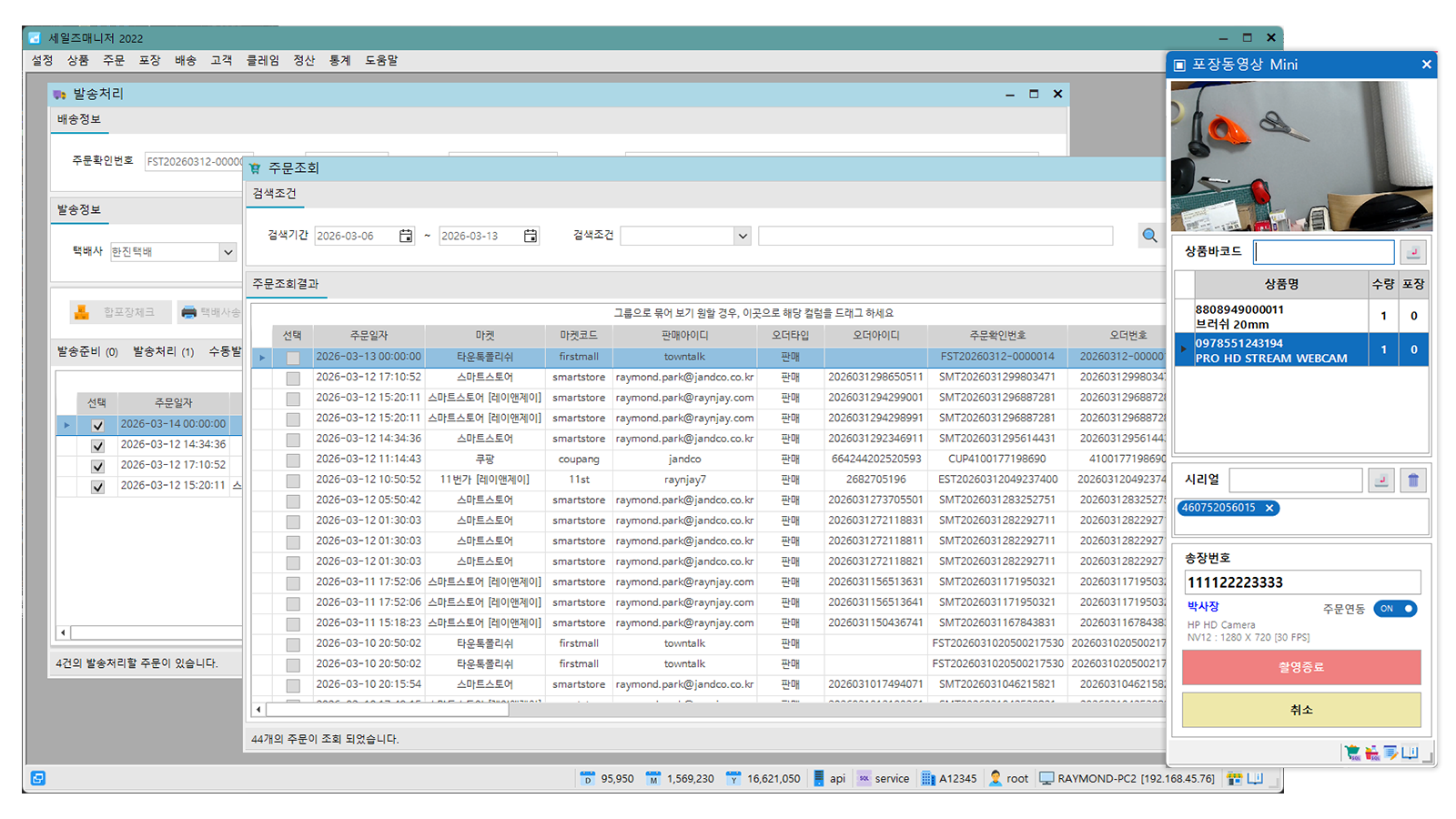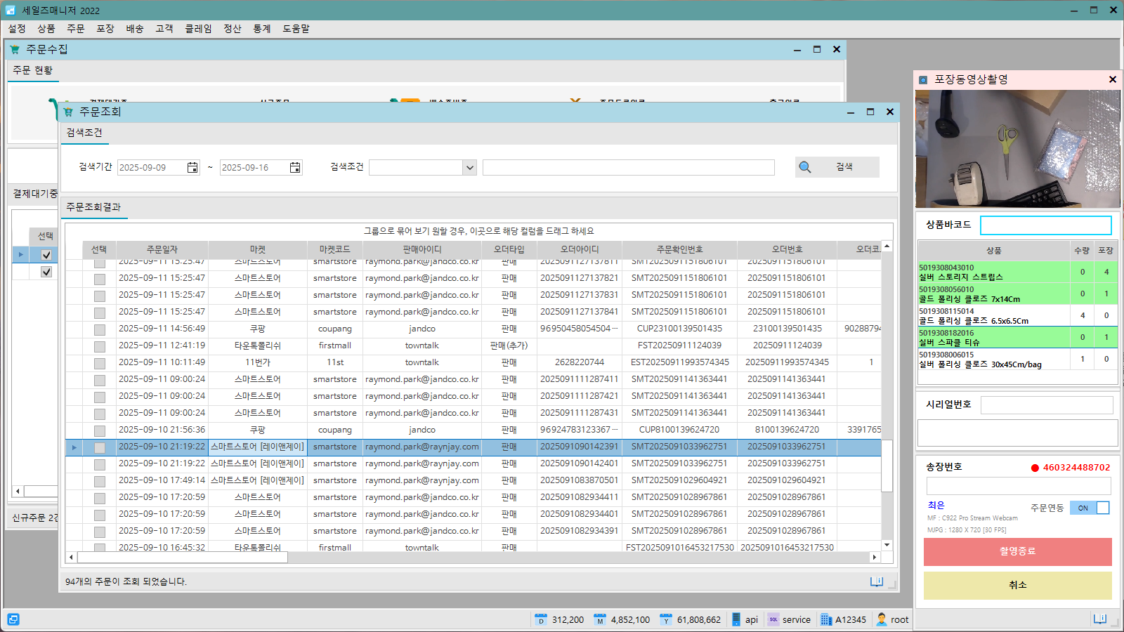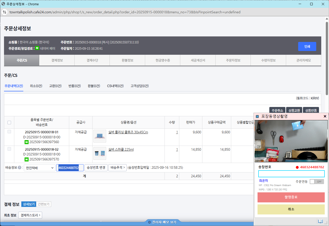 동일한 컴퓨터에서 사용 중인 주문관리 시스템과 연동하여, 클릭 한 번으로 포장 동영상 촬영을 시작할 수 있습니다.